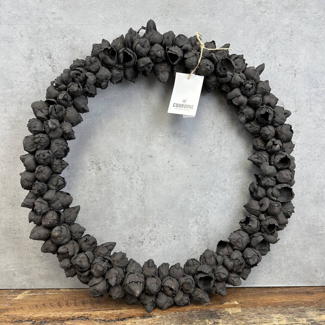 Dünner Kranz aus schwarzen Kokosfrüchten, 45cm, handgefertigte Deko für Wand, Tür oder Tisch im Innenbereich.